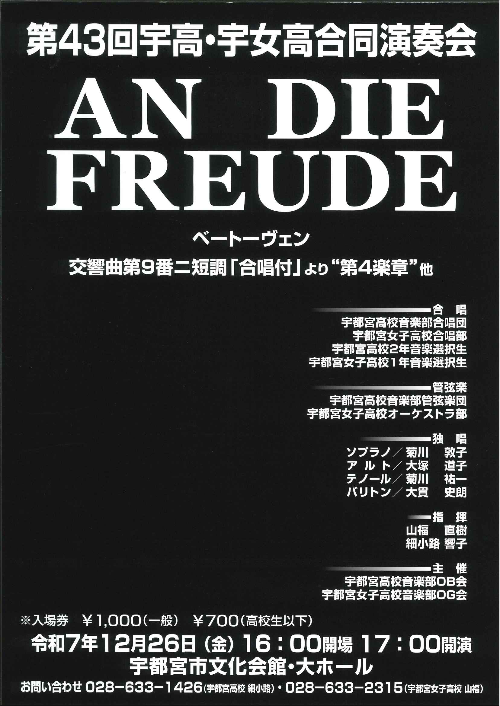 | click | 第43回 宇高・宇女高合同演奏会 AN DIE FREUDE ベートーヴェン交響曲第9番ニ短調「合唱付」より“第4楽章”他 |